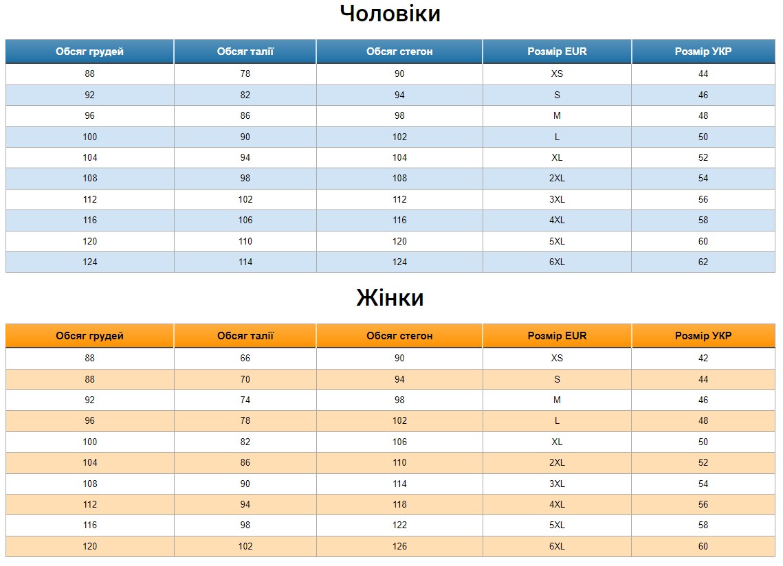 Таблица размеров Украина